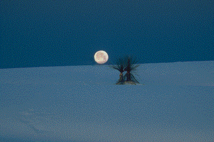 A full moon sets over sand and yucca. Actually not true sand, White Sands National Monument gets its whiteness from gypsum, a salt.
