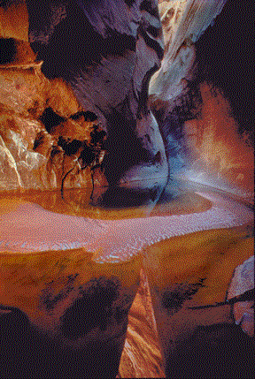 This pool and its unusual reflections are located in one of the most remote canyons in southern Utah. Colors produced from sunlight bouncing off the canyon walls add to the unique beauty of this gorge.