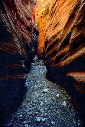 Stretching for nearly two miles, this slot canyon in Utah exhibits varied texture and colors from its sandstone walls.