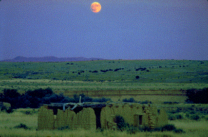 From the nameless deserts of central New Mexico, an autumn moon rises over the Jemez Mountains with an adobe ruins in the foreground.