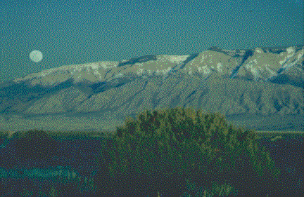 A perigee full moon rises over the Sandia Mountains in central New Mexico.